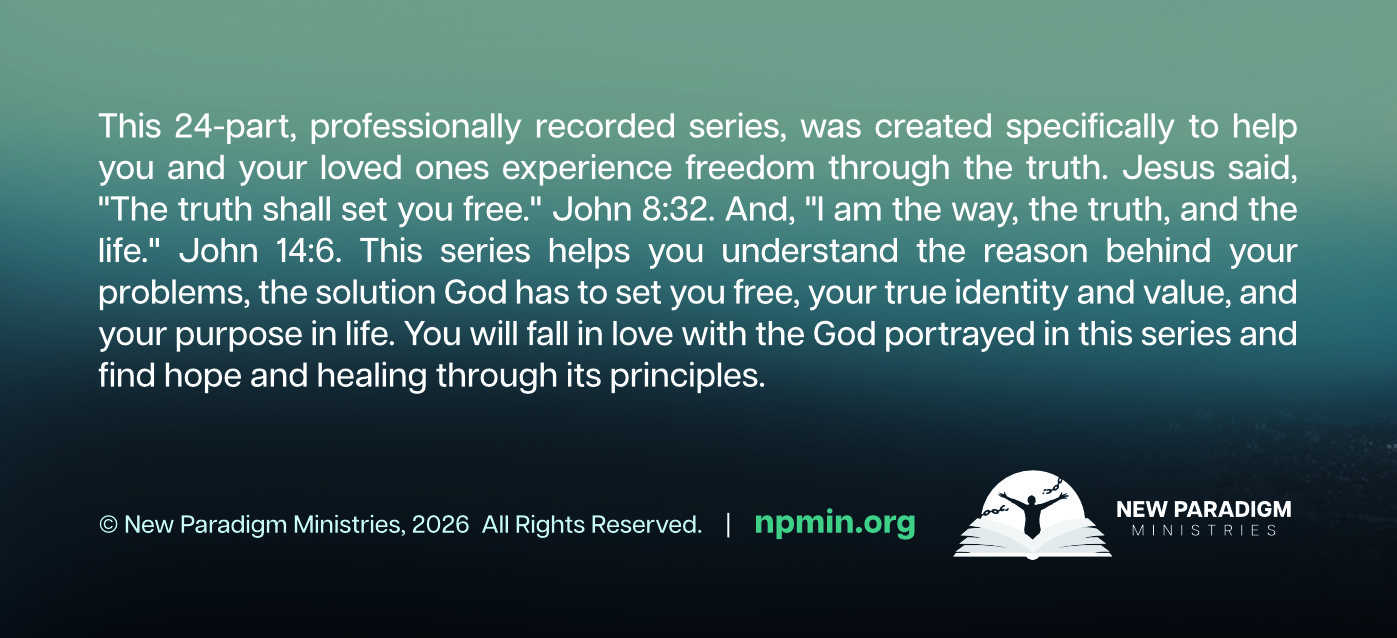 This 24-part, professionally recorded series, was created specifically to help you and your loved ones experience freedom through the truth. Jesus said, “The truth shall set you free.” John 8:32. And, “I am the way, the truth, and the life.” John 14:6. This series helps you understand the reason behind your problems, the solution God has to set you free, your true identity and value, and your purpose in life. You will fall in love with the God portrayed in this series and find hope and healing through its principles.